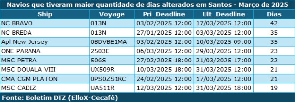 De acordo com o Boletim DTZ, o Porto de Santos, que respondeu por 78,5% dos embarques de café no primeiro trimestre de 2025, registrou um índice de 63% de atraso ou alteração de escalas de navios, o que envolveu 113 do total de 179 porta-contêineres. O tempo mais longo de espera no mês passado foi de 42 dias no embarcadouro santista.