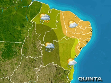 Dia de sol forte e tempo firme de SE ao CE. Sol entre muitas nuvens, com várias pancadas de chuva no oeste e no sudoeste da BA. Nas demais áreas da Região, faz sol e calor, com pancadas isoladas de chuva.