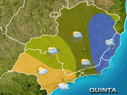 Muitas nuvens se espalham sobre MG, ES, RJ e chove a qualquer hora. Risco para temporais. Sol e pancadas de chuva a partir da tarde no Triângulo e Sul de MG e nodeste de SP. Nas demais áreas de SP o sol aparece mais forte e não chove nesta quinta.