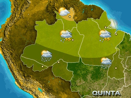 Áreas de instabilidade provocam chuvas frequentes no sul do TO e do PA, no AC e no litoral do AP. No norte de RR o sol predomina e não chove. Nas demais áreas da Região, faz sol e muito calor, com pancadas isoladas de chuva a partir da tarde.