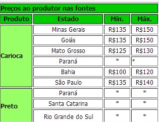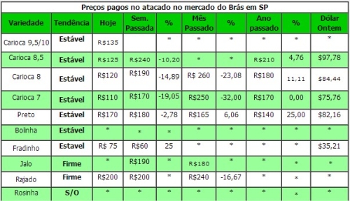 Feijão carioca: Hoje (21), houve oferta de 24.000 sacas com sobras de 10.000 sacas por volta das 7:30. As referências foram de: R$135 nota 9,5, R$125 nota 8,5 , R$120 nota 8, R$110 nota 7 e R$ 90 nota 6.