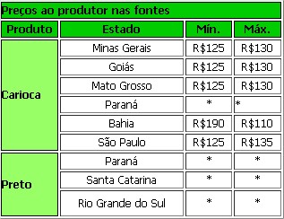 Feijão preto: Observando a colheita dos EUA de feijões as atenções se voltam para a possibilidade de importar o grão de lá. Apesar de ser um feijão com excelente aparência e qualidade o preço impossibilita as negociações. O México que não comprou da China, paga por safra nova que começa a ser colhida, por US$ 1200. Desta forma os empacotadores brasileiros começam a olhar novamente as ofertas de produto chinês safra 2012, que chegará em novembro ao redor de US$ 1150. No mercado interno poucos negócios por R$ 165 no porto de Paranaguá.