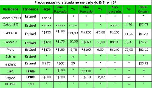 Feijão preto: Com mais compradores os possíveis vendedores vem protelando a venda. Os importadores colocam pequenos volumes a venda por R$ 165. Espera-se agora que os produtores iniciem em breve o plantio no Paraná.