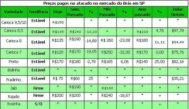 Feijão carioca: A boa oferta nesta madrugada declarada pelos agentes do Brás em São Paulo não foi suficiente para recuar os preços de referências naquela cidade. Houve oferta de 32.000 sacas e às 07h30 sobravam, aproximadamente, 22.000 sacas.