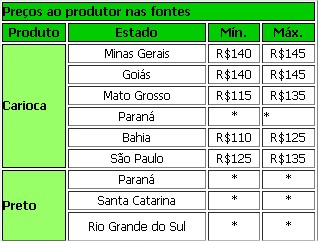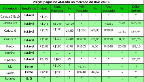 Feijão preto: Com a baixa das cotações do dólar os importadores que tem cargas viajando aproveitam para fechar cambio. A partir de agora provavelmente não acontecerá novas importações, pois este produto se for embarcado em Outubro chegará sob a volta da vigência do Imposto de Importação de 20% a partir de 1º de Dezembro. Aqui no porto de Paranaguá a cotação segue em R$ 165.