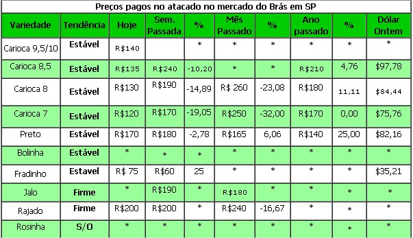 Feijão carioca: Na madrugada de hoje (03), houve oferta de 19.000 sacas com sobras de, aproximadamente, 14.000 sacas. As referências de preço permaneceram em R$ 140 para nota 9; R$ 135 para nota 8,5 e R$ 130 para nota 8.
