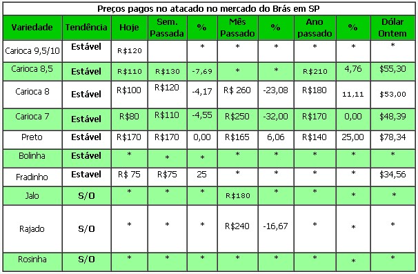 Feijão carioca: A maior parte da oferta desta madrugada era de feijão armazenado na região do Brás em São Paulo. Apenas 2.300 sacos de feijão disponíveis eram recém colhidos dos aproximadamente 17.500 sacos ofertados. Os preços subiram nesta madrugada mesmo com a tentativa de ofertar o feijão que já estava lá. As referências foram nota 9,5 R$ 120, 8,5 R$ 105, 8 R$ 95/100.
