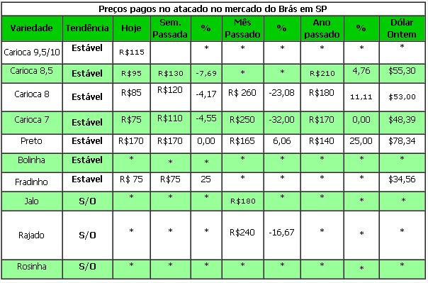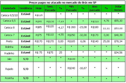 Feijão carioca: Por volta de 9.000 sacas foram ofertadas em São Paulo nesta madrugada. Restavam às 7:30 aproximadamente 4.000 sacas. As referência foram nota 9,5 R$115; nota 8,5 R$95 e nota 8 R$85.