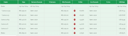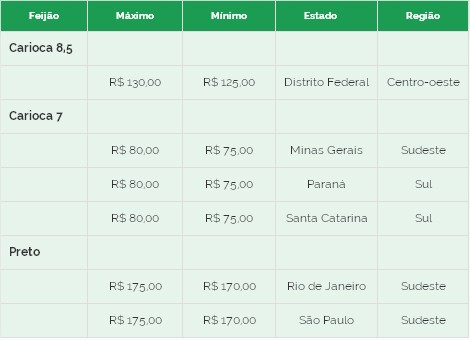 Feijão: As referências do nota 8 R$ 120, nota 7 R$ 95 e o feijão preto R$ 185,00