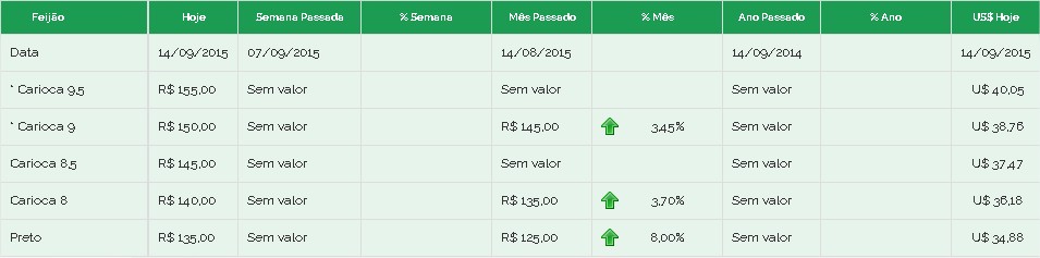 Em pleno sábado os compradores estavam ativos. Foi pago, em Goiás, até R$ 140,00. Mercadoria Pérola ou Estilo mantêm-se com grande preferência, quando recém-colhido. O mercado, ao manter estes níveis no meio do mês, indica que, entre setembro e outubro, pode haver mudança de patamar. A disputa por Feijão 8,5/9 acima forçará as cotações para cima. Não há volume de ofertas de produto intermediário entre 7/8, uma vez que todo Feijão colhido na segunda e, agora, na terceira safra tem sido imediatamente consumido.