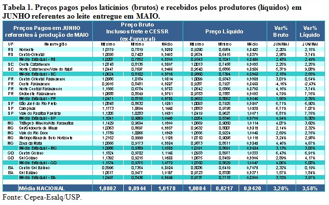 AO PRODUTOR – Em junho, o preço bruto pago ao produtor de Goiás continuou sendo o maior dentre os estados que compõem a “média Brasil”, alcançando R$ 1,0772/litro, alta de 4,1% em relação a maio (4,2 centavos/litro). Logo em seguida vem São Paulo, onde a média foi de R$ 1,0449/litro, acréscimo de 4,9% (ou 4,9 centavos/litro); Minas Gerais, que teve reajuste de 3,1% (3,2 centavos), com o litro a R$ 1,0385.