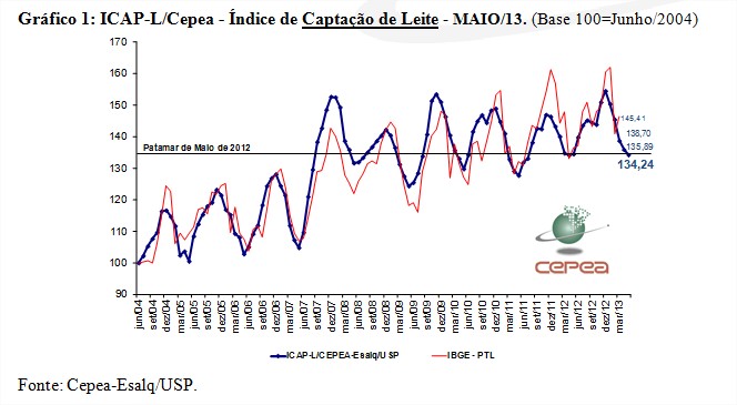 A oferta de leite no campo continua restrita; nem mesmo a chegada da safra sulista fez com que o quadro se alterasse. Agentes consultados pelo Cepea explicam que a produção do Sul do Brasil não veio com a força esperada, avançando somente 0,72% em relação a abril, de acordo com o Índice de Captação de Leite do Cepea (ICAP-Leite). Porém, considerando-se todos os estados da pesquisa, a captação recuou 1,22%, sendo Minas Gerais o que teve maior diminuição do volume (4,1%).