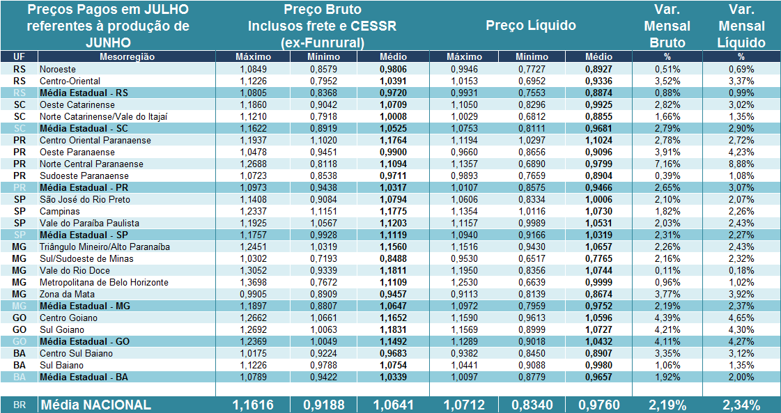Preços pagos pelos laticínios (brutos) e recebidos pelos produtores (líquidos) em JULHO referentes ao leite entregue em JUNHO