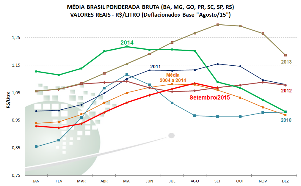 Preços médios pagos ao produtor - “Média Brasil” (MG, PR, RS, SC, SP, GO e BA)