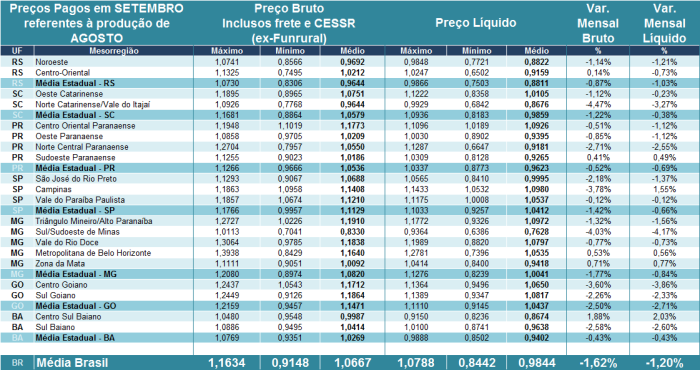 Para o próximo mês, a expectativa da maior parte dos representantes de laticínios/cooperativas é de queda nos preços. Entre os compradores consultados pelo Cepea, 85,4% deles, que representam 93,9% do leite amostrado, acreditam que haverá novo recuo em outubro, enquanto apenas 14,6% dos agentes, que representam 6,1% do volume captado, sinalizam estabilidade para o próximo mês. Essas expectativas refletem o aumento da disponibilidade de leite nas principais regiões produtoras, principalmente nos estados da região Sul.
