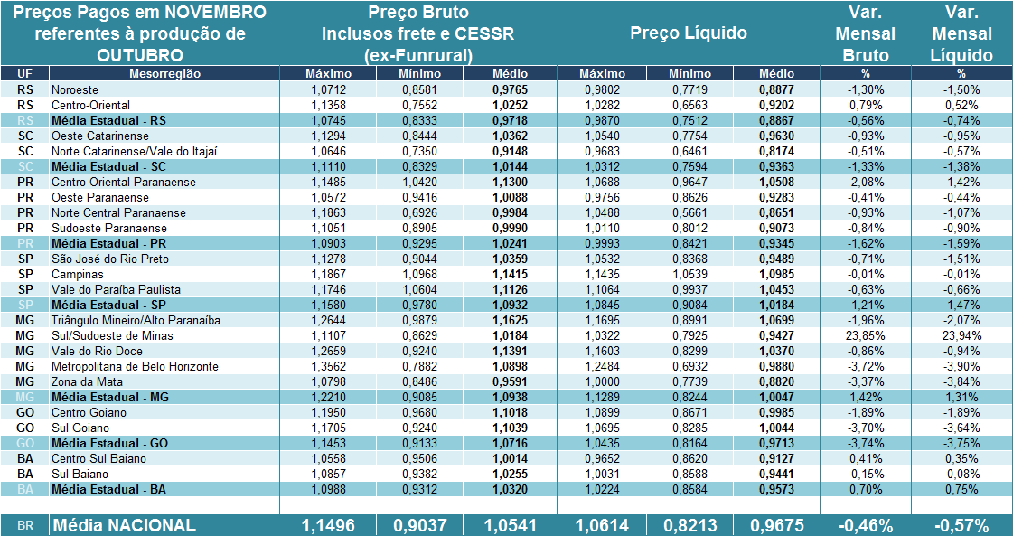 O movimento sazonal de enfraquecimento dos preços do leite ao produtor se manteve em novembro, mas algumas atenuantes limitaram as quedas. Uma delas são as chuvas, excessivas no Sul e escassas no Nordeste. Outra foi um forte reajuste em Minas Gerais.