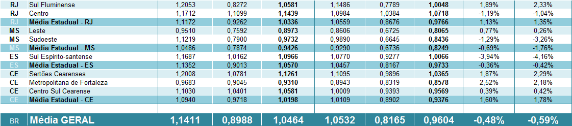 Tabela 2. Preços em estados que não participam da “média nacional” – RJ, MS, ES e CE