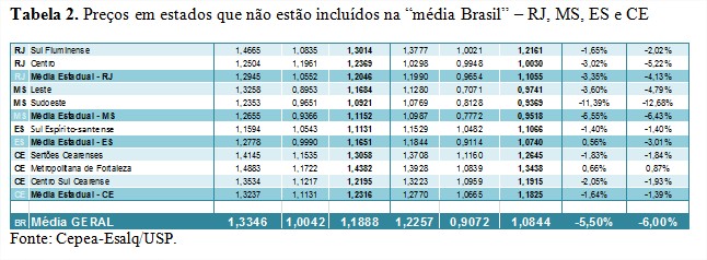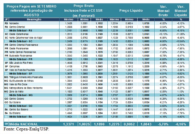 Tabela 1. Preços pagos pelos laticínios (brutos) e recebidos pelos produtores (líquido) em SETEMBRO/17 referentes ao leite entregue em AGOSTO/17