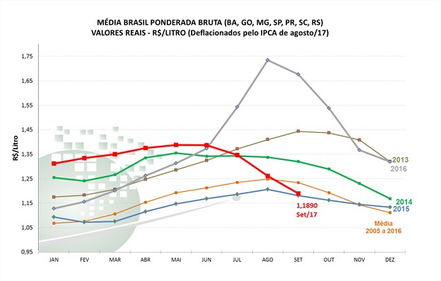 Gráfico 3. Série de preços médios pagos ao produtor (bruto), em valores reais (deflacionados pelo IPCA de agosto/17)