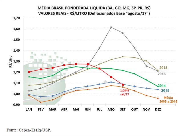O preço do leite entregue em agosto e recebido pelo produtor em setembro registrou a quarta queda consecutiva no campo, com recuo de 7 centavos/litro (ou de 6,16%) frente a agosto, segundo pesquisas do Cepea (Centro de Estudos Avançados em Economia Aplicada), da Esalq/USP. O preço líquido, que não considera frete ou impostos, fechou a R$ 1,0843/litro na “média Brasil”, que inclui os estados de BA, GO, MG, SP, PR, SC, RS. Na comparação com setembro do ano passado, a diminuição é de quase 48 centavos/litro, ou de 30,6% (dados deflacionados pelo IPCA de agosto/17). As sucessivas baixas no valor do leite se justificam pela fraca demanda e pelo aumento da captação.