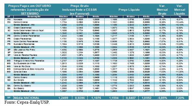 Outubro foi marcado pela grande expectativa quanto à precificação do leite entregue em setembro, devido aos baixos patamares nos últimos meses e à recente decisão do Mapa (Ministério da Agricultura, Pecuária e Abastecimento) de suspender as importações uruguaias de leite em pó. No entanto, a baixa demanda por lácteos na ponta final da cadeia continuou impactando o mercado, levando à quinta queda consecutiva no preço do leite recebido pelo produtor. De acordo com pesquisas do Cepea (Centro de Estudos Avançados em Economia Aplicada), na “média Brasil” líquida (que inclui os estados de BA, GO, MG, SP, PR, SC, RS e não considera frete nem impostos), o recuo foi de 8 centavos/litro (ou de 7,3%) frente ao mês anterior, chegando a R$ 1,005/litro.