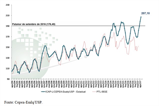 Gráfico 1. ICAP-L/Cepea - Índice de Captação de Leite – SETEMBRO/17 (Base 100=Junho/2004)