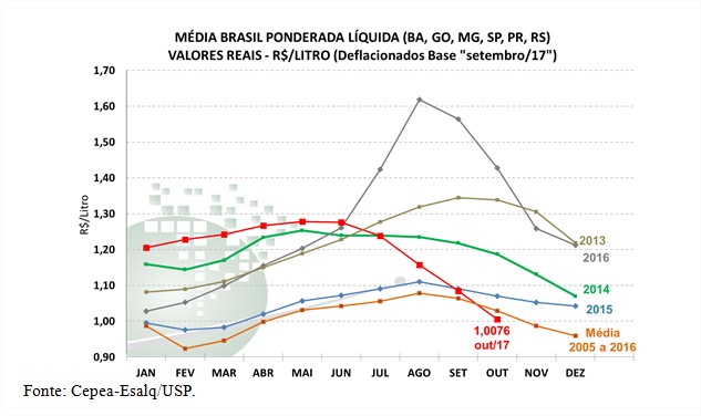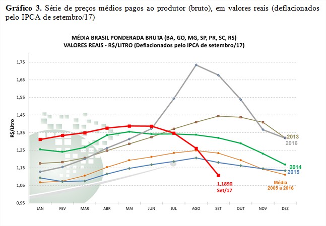 Gráfico 2. Série de preços médios recebidos pelo produtor (líquido), em valores reais (deflacionados pelo IPCA de setembro/17)
