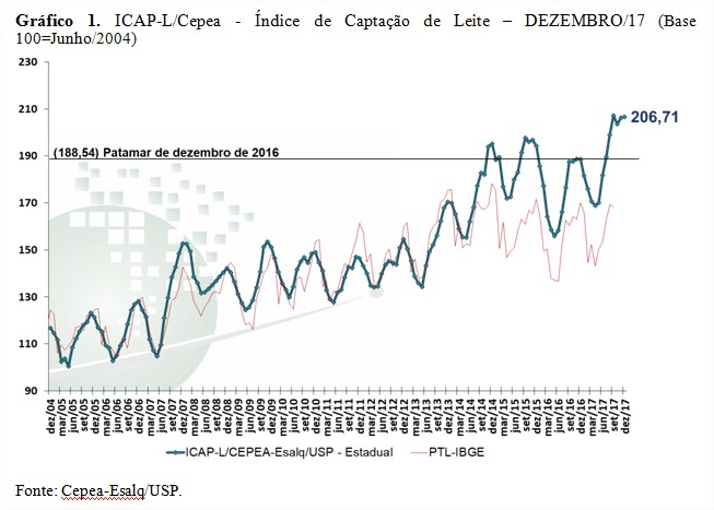 Outro fator que também pressionou as cotações, de acordo com pesquisadores do Cepea, foi a alta da captação em muitos estados, em decorrência do maior volume de chuvas. O aumento na captação em dezembro frente ao mês anterior no Paraná foi de 5,86%, na Bahia, de 1,87%, em Minas Gerais, de 1,39% e, em São Paulo, de 0,51%. Já em Santa Catarina, Rio Grande do Sul e Goiás, a captação recuou 3,37%, 2,65% e 2,22%, respectivamente, em função do desestímulo do produtor diante das baixas cotações. Segundo colaboradores, muitos produtores já deixaram a atividade, enquanto outros têm aumentado o abate de vacas e investido menos na produção. Esses resultados levaram a um ligeiro aumento de 0,23% do Índice de Captação de Leite do Cepea (ICAP-L) de novembro para dezembro.