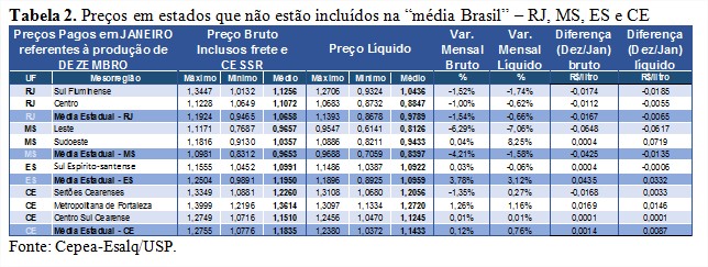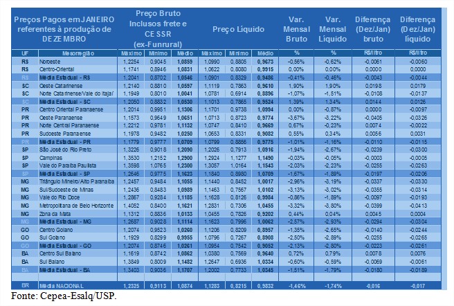 Houve diminuição nas médias de todos os estados acompanhados pelo Cepea – com exceção de Santa Catarina, que apresentou alta de 1,34% de dezembro para janeiro, devido ao menor volume captado. Dentre os estados, a maior queda foi observada em Minas Gerais, de 2,93%, seguida por Goiás (com baixa de 2,80%), São Paulo (-1,89%), Bahia (-1,79%), Paraná (-1,16%) e Rio Grande do Sul (-0,46%).