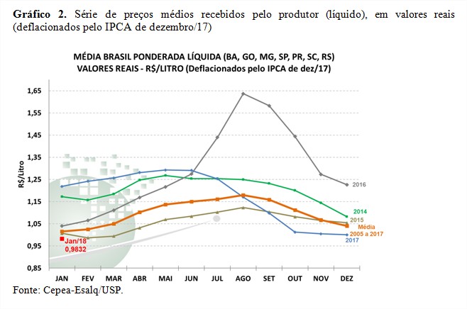 Contrariando as expectativas de agentes do setor, o preço do leite recebido por produtores em janeiro caiu 1,74% (ou 0,017 centavo/litro) frente ao mês anterior, chegando a R$ 0,9832/l na “média Brasil” líquida (que inclui preços sem frete e impostos da BA, GO, MG, SP, PR, SC e RS). De acordo com pesquisas do Cepea (Centro de Estudos Avançados em Economia Aplicada), da Esalq/USP, na comparação com janeiro/17, o recuo é de quase 20%, sendo a atual média a menor desde fevereiro de 2010, quando foi de R$ 0,9369 (valores deflacionados pelo IPCA de dez/17).