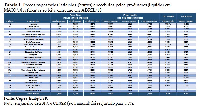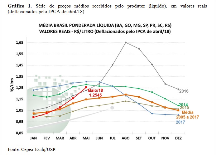 Confirmando as expectativas dos colaboradores do Cepea (Centro de Estudos Avançados em Economia Aplicada), da Esalq/USP, o preço pago ao produtor em maio (pelo leite captado em abril) subiu pelo quarto mês consecutivo. A “média Brasil” (inclui BA, GO, MG, SP, PR, SC e RS) líquida foi de R$ 1,2545/l, altas de 8,4% frente ao mês anterior e de 24,2% no acumulado parcial deste ano. A média de maio também foi a maior desde julho/17, em termos reais, deflacionados pelo IPCA de abril/18.