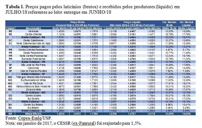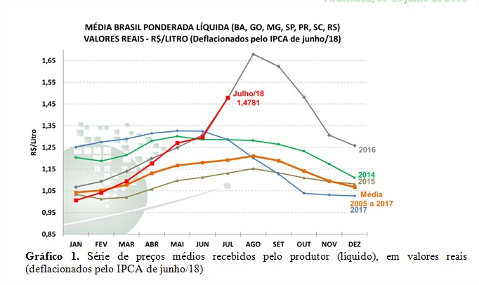 O preço do leite recebido por produtores subiu em julho pelo sexto mês consecutivo e atingiu recorde real para o mês, de acordo com pesquisas do Cepea (Centro de Estudos Avançados em Economia Aplicada), da Esalq/USP. Já quando considerados todos os meses da série histórica, a média de julho é a maior desde outubro de 2016, também em termos reais (valores foram deflacionados pelo IPCA de jun/18).