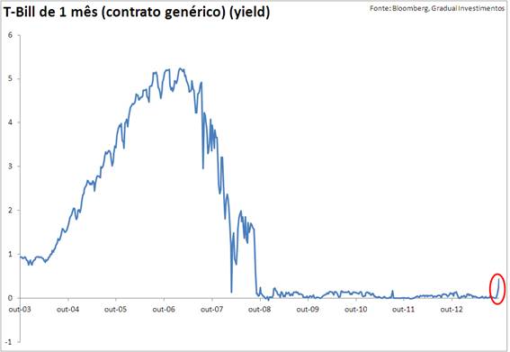Os congressistas têm até a meia-noite de hoje para evitar o desastre. São US$ 120 bilhões que vencem amanha e o Secretário do Tesouro Jacob J. Lew já mandou avisar que não vai ter como honrar os títulos. O mercado já antecipou e os yields de contratos curtos (de um mês) explodiram na mão dos investidores saindo de algo como zero de juros semanas atrás para 0,40 na manhã de hoje.