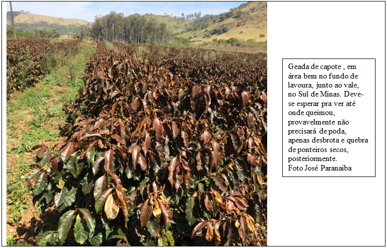 Apesar de não se conhecer, com boa precisão, a extensão das áreas afetadas pelas últimas geadas, já existem indicações de maior efeito em fundos de lavouras e em ares bem planas, na forma de geada de irradiação típica, na qual o ar frio se deposita nas partes mais baixas do terreno e, ainda, pela mesma razão, maiores danos têm sido observados em lavouras novas, em formação.
