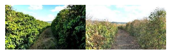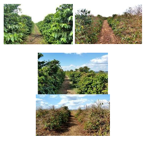 Nos três conjuntos de fotos acima, tomadas de lavouras comerciais na região da Mogiana-SP, em Franca, pode-se ver a condição dos cafeeiros antes (em maio de 2016, esquerda) e depois (julho de 2016, dir.) da condição de clima e da colheita.