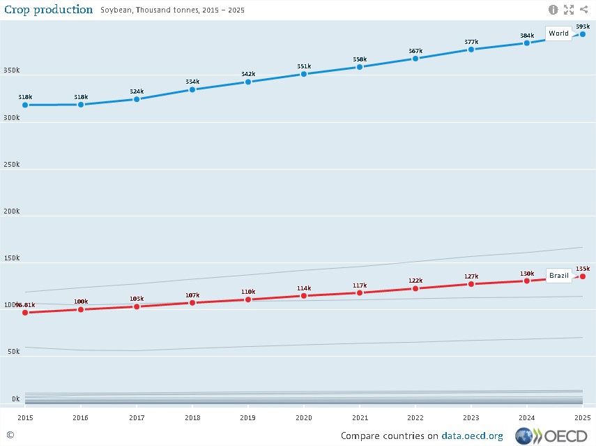 A OCDE acredita que sim. Projeções da organização indicam que, na safra 2016/17, o Brasil possa colher 103,202 milhões de toneladas de soja, o que corresponde a 31,81% das 324,466 milhões de toneladas que deverão ser produzidas no mundo. Em 2025, essa participação pode subir para 34,39%, com a perspectiva de que o mundo colha 393,891 milhões de toneladas da oleaginosa, com 135,46 milhões brasileiras.