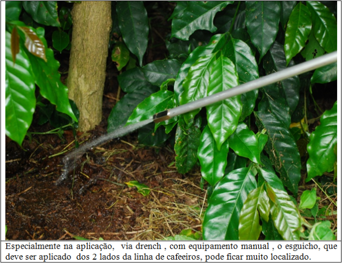 O sistema de aplicação de produtos via “drench”, ou seja, na forma de um esguicho, sob a saia do cafeeiro, foi desenvolvido e tem largo uso para a aplicação de fungicidas/inseticidas de solo, no controle de doenças e pragas da lavoura.