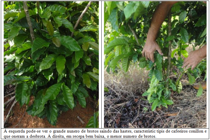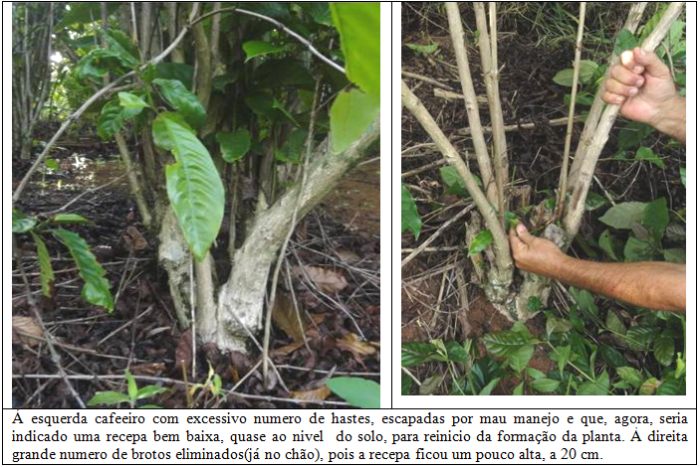 O cafeeiro conillon, pela sua natureza multi-caule, condiciona modos diferenciados, quando da execução da poda de recepa das plantas, em comparação aos que se pratica em cafeeiros arábica.