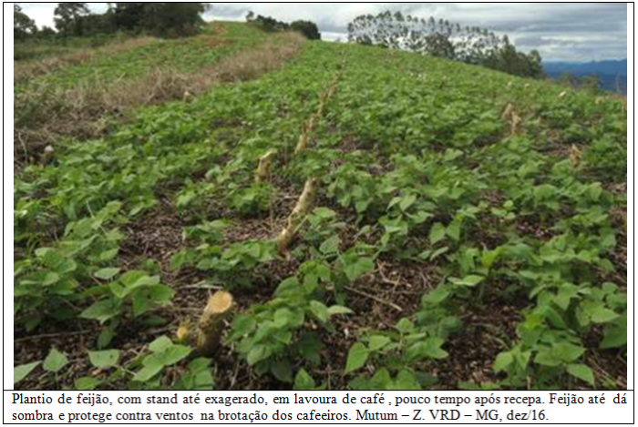 Faz alguns anos atrás, na época do ex-IBC, num período em que faltava feijão, realizamos campanha do seu plantio no meio do cafezal, tendo havido sucesso, pois conseguiu-se, num só ano, plantar 400 mil ha dessa cultura, boa fornecedora de proteina.