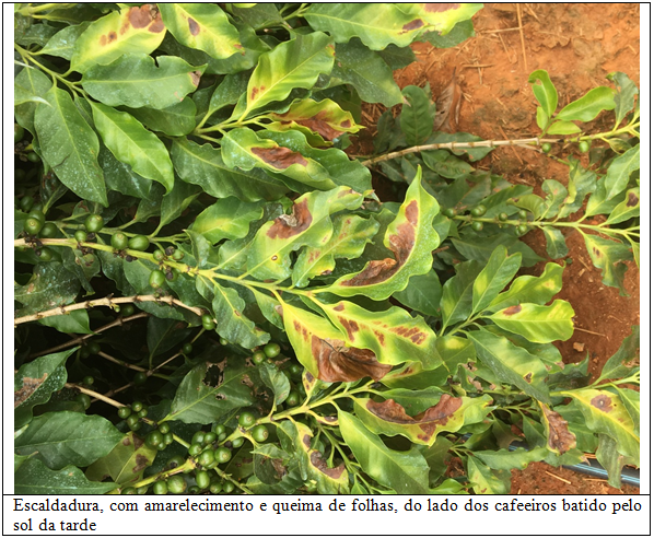 A escaldadura, está causando muita preocupação, pois veio de forma grave. A  folhagem de cafeeiros, do lado voltado para o sol da tarde, teve um forte amarelelecimento e queima parcial de folhas. Ela esteve relacionada com o excesso de insolação e temperaturas altas, também em dez/jan e, por isso, foi mais observada em regiões um pouco mais quentes.