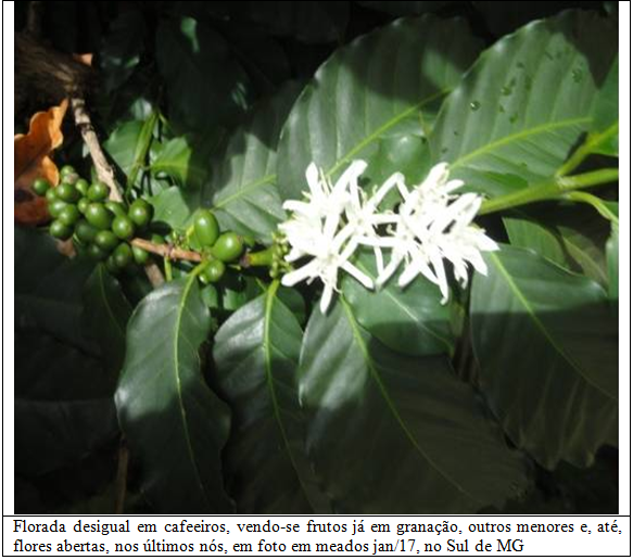 A floração, por efeito de chuvas mais cedo, teve inicio ainda em setembro/16, depois seguindo-se 2-3 floradas em períodos normais (out/dez) e, agora, em meados de janeiro, uma florada fora de hora. As ocorrências variam de região para região, mas, no geral, 2-3 nós, na ponta dos ramos, abriram flores em uma época anormal, provavelmente por efeito de um pequeno veranico, seguido de chuva em dez/jan.
