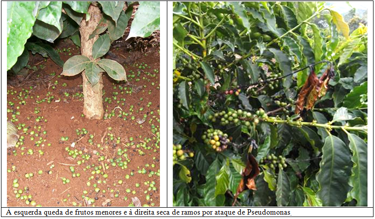 Como consequência desses problemas serão observados os efeitos negativos sobre a produção dos cafeeiros e a qualidade dos cafés. A queda de frutinhos reduz o numero de frutos remanescentes nas rosetas e nos ramos, a desigualdade de floração resultará em colheita de verdes e a ultima florada poderá, com frutos ainda em agua, nem ser aproveitada. Isso influi na quantidade e qualidade do café. A escaldadura influi na granação dos frutos e agrava o ataque de cercospora. O ataque de Pseudomonas, com a seca de ramos, reduzirá a área produtiva das plantas.
