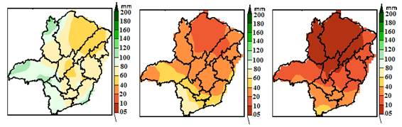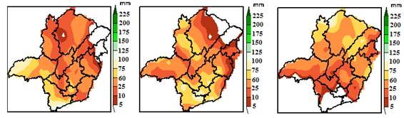 Figura 3 – Distribuição das chuvas em Minas Gerais, para os meses de abril, maio e junho, médias climatológicas para o período 1961-1990.