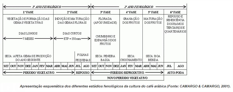 O cafeeiro arábica leva dois anos para completar seu ciclo e o sucesso de sua produção está associada ao sincronismo entre suas fases fenológicas e o clima local.