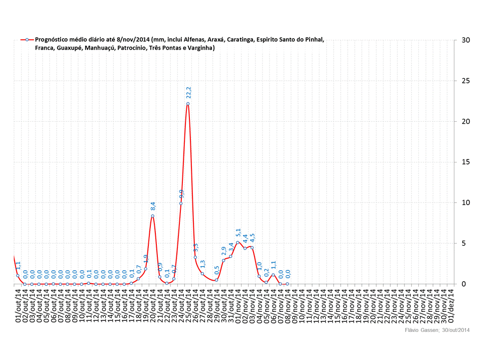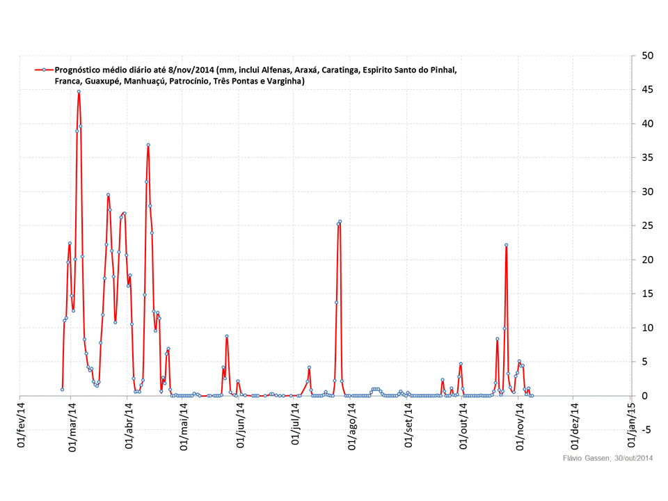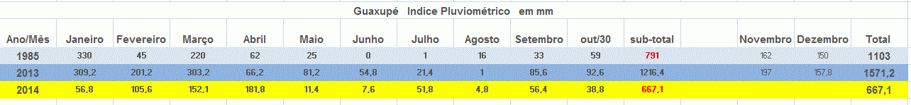 As chuvas acumuladas entre Janeiro e Outubro de 2014  em Guaxupé-MG  foram de apenas 667,1 mm  , portanto inferior aos 791 mm ocorridos no mesmo período do ano de 1985 , e para chegar no fim do  ano igual ao total do ano de 2013 , será necessário chover 904 mm em Novembro e Dezembro.