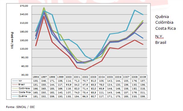 Para esses agricultores dado a declividade das terras impedindo outras lavouras economicamente viáveis. Com isso os cafeicultores, dessas regiões, tornaram-se verdadeiros escravos em prol dos demais elos da cadeia do Agronegócio Café. O resultado disso tudo foi um empobrecimento dos municípios produtores. Quando comparamos o I.D.H. (Índice de Desenvolvimento Humano) observamos que os municípios produtores de café estão abaixo de outros municípios da região. Os municípios perderam em arrecadação, os cafeicultores perderam receitas e os trabalhadores rurais sacrificados pela baixa remuneração da mão-de-obra. Resultando pobreza e miséria. O Brasil perdeu bilhões de dólares em divisas pela pratica de preços ridículos em relação aos países concorrentes. Alem disso, podemos ser acionados internacionalmente, pelas leis da OMC (Organização Mundial do Comercio) por um verdadeiro “dumping” no mercado cafeeiro. A nossa política de preço foi extremamente predatória, vendendo sempre com preços abaixo dos concorrentes, como observamos no gráfico abaixo.