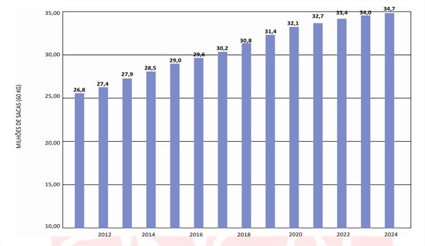 Traçado uma perspectiva em cima da retrospectiva, dos últimos 15 anos, e crescendo 2% ao ano, pela própria demanda do mercado, nos próximos 15 anos, exportaremos mais de 450 milhões de sacas (conforme gráfico abaixo) e com isso acumularemos mais 18 bilhões de U$$ que serão evadidos do Brasil e das regiões produtoras. Na somatória da retrospectiva e da perspectiva estamos calculando um prejuízo a nossa nação de 30 Bilhões de dólares, INACREDITÁVEL! Precisamos de mudanças radicais imediatamente, no “Statu Quo”, ou o setor produtivo estará fadado ao desaparecimento provocando um desemprego massivo.
