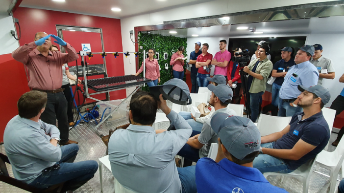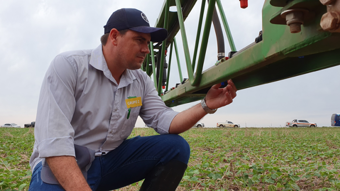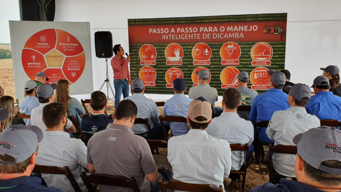 Produtores rurais recebem treinamento para utilização correta do herbicida Dicamba e recomendações para tipo de bico utilizado, altura da barra, velocidade do pulverizador, condições climáticas, volume de calda e distância de segurança para outras culturas
