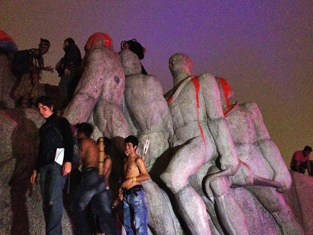 Manifestantes jogaram tinta vermelha e picharam a frase "bandeirantes assassinos" com tinta branca no Monumento às Bandeiras, em frente ao Parque Ibirapuera, na Zona Sul de São Paulo, na noite desta quarta-feira (2). Os autores do vandalismo contra o monumento participavam do protesto dos índios, que começou por volta das 17h30 na Avenida Paulista. Às 21h, os manifestantes deram um abraço simbólico no monumento.