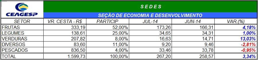 O setor de legumes registrou elevação de 1%. Principais altas: Inhame (23,7%), pepino japonês (21,5%), berinjela (12,7%), chuchu (12,15). Principais quedas: Pimentão vermelho (-22,4%), abobrinha italiana (-16,9%), pepino caipira (-13,5%), vagem macarrão (-13,7%).